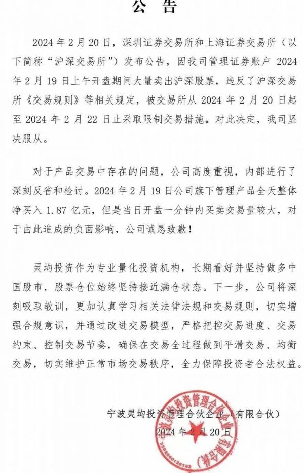 2月20日,上交所与深交所分别发布公告称,在交易监控中发现宁波灵均于2月19日开盘后短时间内大量卖出沪市股票与深市股票合计25.67亿元,导致A股大幅跳水,给予宁波灵均限制交易3天并公开谴责的处罚。