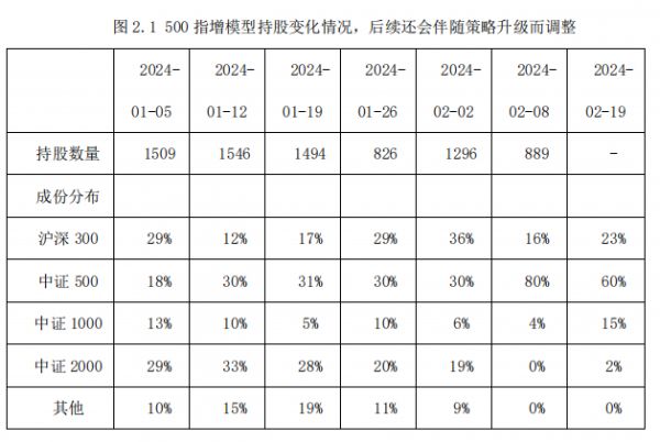 从灵均投资最近公布的周500指增模型持股变化情况来看,中证500指成分股的占比,自今年初以来发生了剧烈的变化,1月5日中证500成分股的占比为18%,到了1月12日提升至30%,并维持这一比例到2月2日。而在节前最后一个交易日2月8日,中证500成份股的占比快速提升至80%,而节后2月19日的首个交易日又迅速降至60%。这也意味着仅仅在一天之内,灵均500指增模型中,中证500的比例就降低了20个百分点。