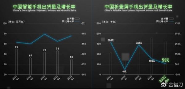 在2023年第一季度,中国智能手机市场出货量同比下滑了 11.8%,但是折叠屏手机却同比上涨了 52.8%。