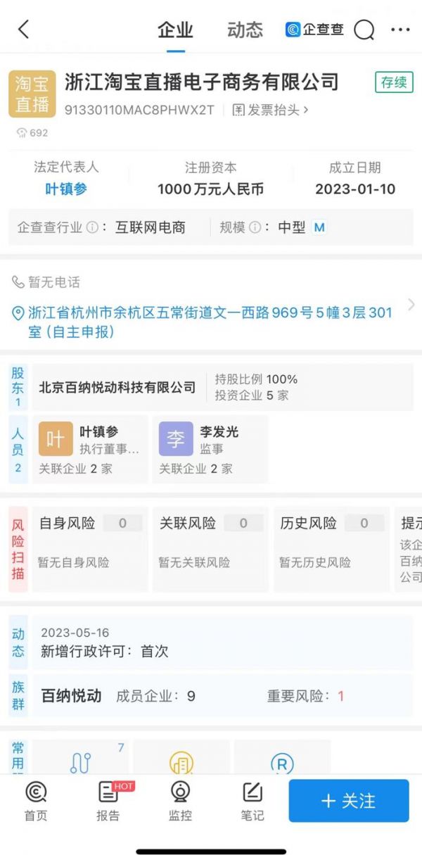 据悉,浙江淘宝直播电子商务有限公司成立于2023年1月,叶镇参担任法定代表人和执行董事。