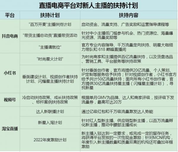 自2020年以来,抖音电商、小红书、视频号、淘宝直播等多个直播电商平台,都推出了一系列扶持新入驻主播的政策,集中体现在冷启动流量包、运营课程指导、广告流量券、供应链资源对接、扣点抽佣减免等方面。具体扶持计划如下表: