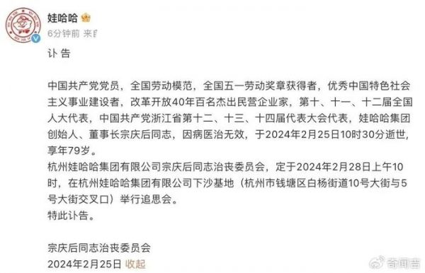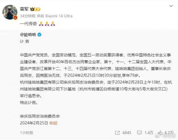 一代传奇宗庆后因病医治无效,于2024年2月25日10时30分逝世,享年79岁。小米集团创始人雷军发文悼念宗庆后,称其是一代传奇。