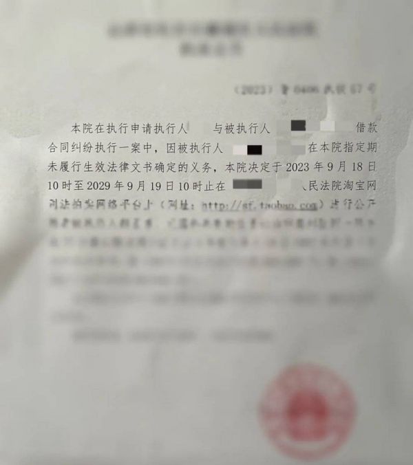 公告显示,房主与人发生借款合同纠纷,在指定期限内未履行义务,因此法院强制执行拍卖其房产,有意者下个月18号可以登录淘宝拍卖网竞买,落款是本地中级人民法院。