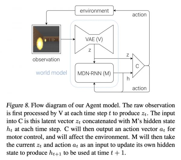 图中纵向V->z是观测的低维表征,用VAE实现,水平的M->h->M->h是序列的预测下一个时刻的表征,用RNN实现,这两部分加起来就是World Model。