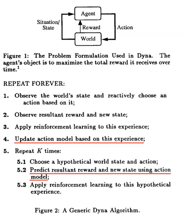 聪明的Sutton在很久以前就意识到model不够准确的问题。在1990年提出Dyna框架的论文 Integrated Architectures for Learning, Planning and Reacting based on Dynamic Programming(发表在第一次从workshop变成conference的ICML上),管这个model叫action model,强调预测action执行的结果。RL一边从真实数据中学习(第3行),一边从model中学习(第5行),以防model不准确造成策略学不好。