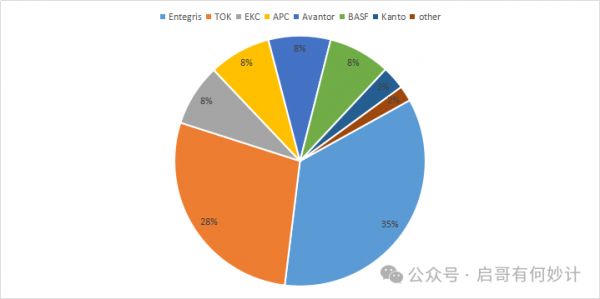 然后就是化学品,它化学品主要是各种清洗液,如刻蚀后清洗、CMP后清洗、去胶液、去残胶液之类的。对标大A的各种化学品公司,相当于是江化微+格林达+晶瑞+中巨芯+新阳。