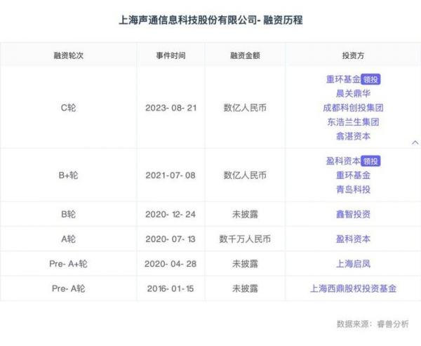 自2015年完成股改的声通科技,截至目前已完成多轮融资,累计融资约5亿元,投资方包括软银中安、盈科资本、嘉兴尚裕、莘庄工业区、成都科技创新投资、东浩兰生、共青城环平、嘉兴诚顺贰期、浙江久立投资等多家投资机构。