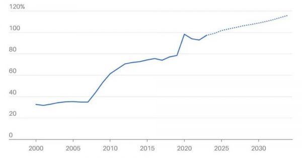 在下一任总统任期内,美国债务占GDP的百分比预计将超过100%,这将是一个具有重要象征意义的水平。