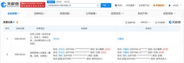 天眼查App信息显示,宗庆后去世前已卸任杭州娃哈哈电子商务有限公司法定代表人、执行董事、经理等职务,由其女儿宗馥莉于2月23日接任。
