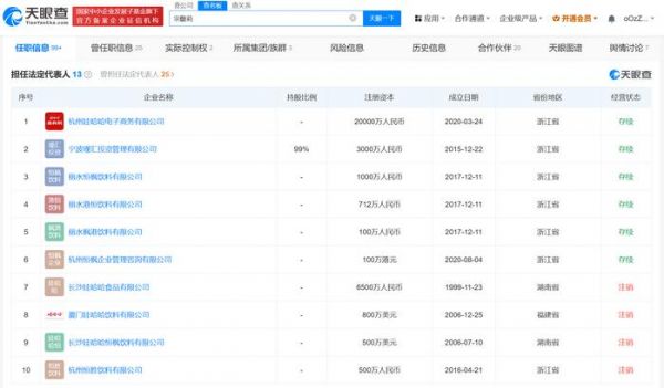 在上述存续企业中,宗馥莉共担任6家企业法定代表人,持有浙江恒枫投资有限公司、宁波瑾汇投资管理有限公司、丽水瑾汇股权投资合伙企业(有限合伙)3家企业股份,并在80余家企业担任董事长、董事、执行董事等高管职务。