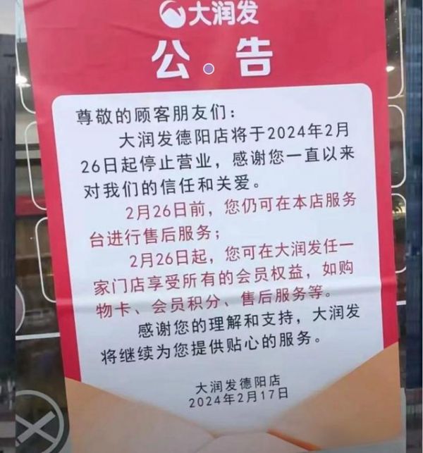 同日,大润发四川德阳店发布公告:将于2024年2月26日起停止营业。