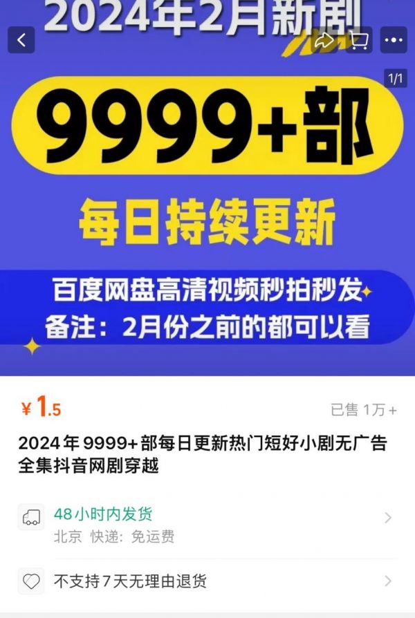 但这还不是最吸引人的价格。在该平台另一家店铺,记者发现,仅需1.5元就能解锁9999+部短剧,且该链接的已售数量达到了1万+。