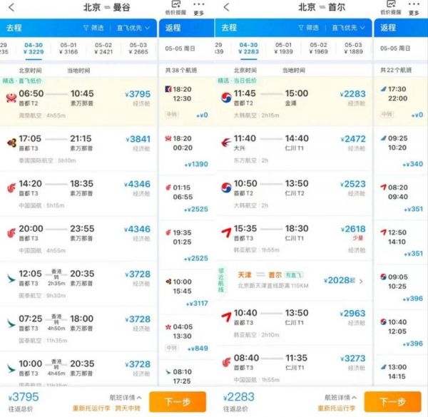 以4月30日~5月5月北京飞泰国曼谷往返机票价格为例,目前(2月23日)查询最低价格不到3800元,北京飞韩国首尔往返价格则不到2300元,北京飞新加坡往返总价在6200元左右,北京飞伦敦随需中转,往返价格最低仅为4500元左右。