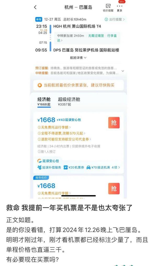 赶在节后机票大跳水的时候,有“未雨绸缪”的人开始安排自己2024年小长假的旅行计划,早早就开始预订出游机票,有的甚至计划把年底出国旅行的机票也直接预订了。