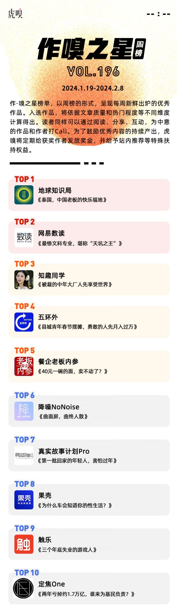 作·嗅之星榜单,以周榜的形式,呈现每周新鲜出炉的优秀作品。2024年1月19日~2024年2月8日,虎嗅第196期作·嗅之星的获奖文章分别是: