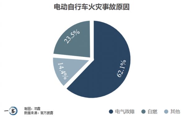 从火灾成因来看,国家消防救援局统计,电气故障是造成电动车火灾的第一大原因,占电动车火灾总数的62.1%,其次是自燃,占23.5%。