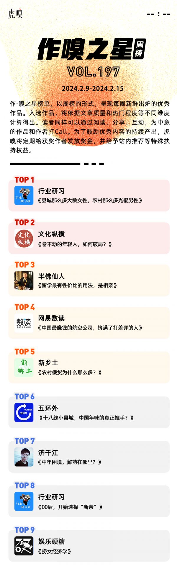 作·嗅之星榜单,以周榜的形式,呈现每周新鲜出炉的优秀作品。2024年2月9日~2024年2月15日,虎嗅第197期作·嗅之星的获奖文章分别是: