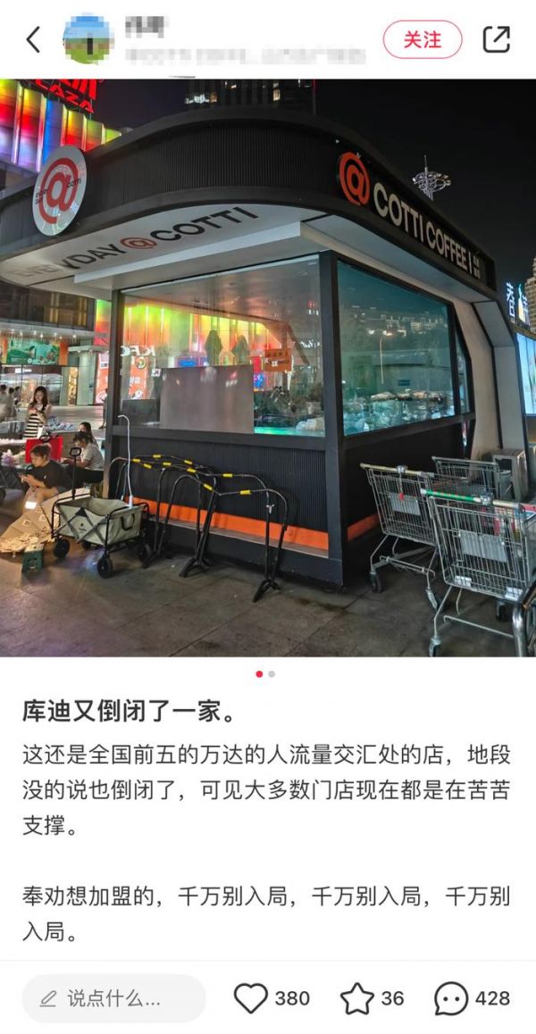 今年春节,库迪联营商们都没过上好年。不少联营商在网上控诉,杯量少,成本高,入不敷出。据报道,有联营商表示,提现的钱没法覆盖进货价,“为了过年囤货,年前半个多月没有提现,但订的1.6万的货卖完了,却才提了5000块钱,再订货又要出6000”。