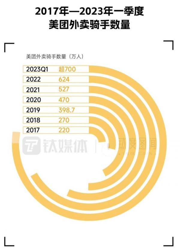 数据显示,2017年美团外卖骑手数量为220万人,2022年骑手数量已增长近3倍达624万人,而截至去年第一季度,美团外卖骑手数量已超过700万人,目前该数字还在持续增长中。