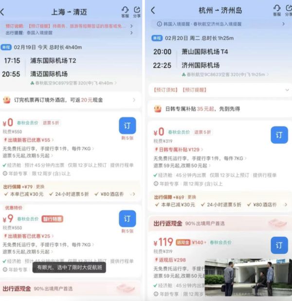 此前有网友晒出了0元机票截图,显示XX旅行APP上2月19日、20日上海-清迈、杭州-济州岛部分航班的单程不含税票价为0元,由春秋航空执飞。