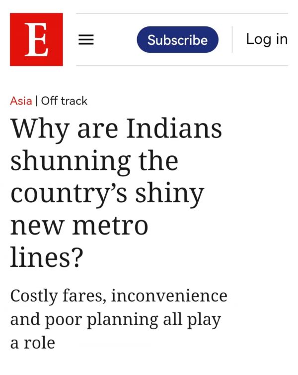 不久前,英国著名的《经济学人》(The Economist)杂志圣诞专刊发表《印度人为何对该国光鲜的新地铁线敬而远之?》一文。文章详细介绍了印度国内地铁建设的盛况,但话锋一转提出,印度大部分城市可能目前并不适合建设地铁。
