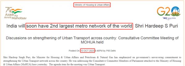 印度住房和城市事务部迅即发布声明“成长的地铁网络反映了快速城市化的年轻印度正在展开的雄心”,逐一驳斥了文章内容,声明认为文章引用的数据不准确,如较为成熟的德里地铁2023年日均客运量超过700万人次(德里地铁2023年实际数据约为550万),已经超过了预计客运量。其认为作者忽视了印度地铁发展的背景,大部分城市的地铁还非常年轻,仅在5~10年左右,客运市场需要时间培育,更重要的是地铁的价值不只是在经济上的,还包括环境和社会价值。
