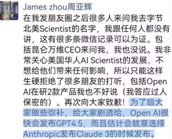 疑似周亚辉在朋友圈透漏 GPT4.5 发布时间