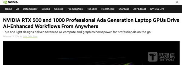 钛媒体App获悉,北京时间2月26日,AI 芯片巨头英伟达(NVIDIA)宣布推出全新NVIDIA RTX 500 和 1000 Ada一代消费级GPU(图形处理器)加速芯片,全面支持在轻薄笔记本电脑等移动设备中运行生成式AI(AIGC)软件。