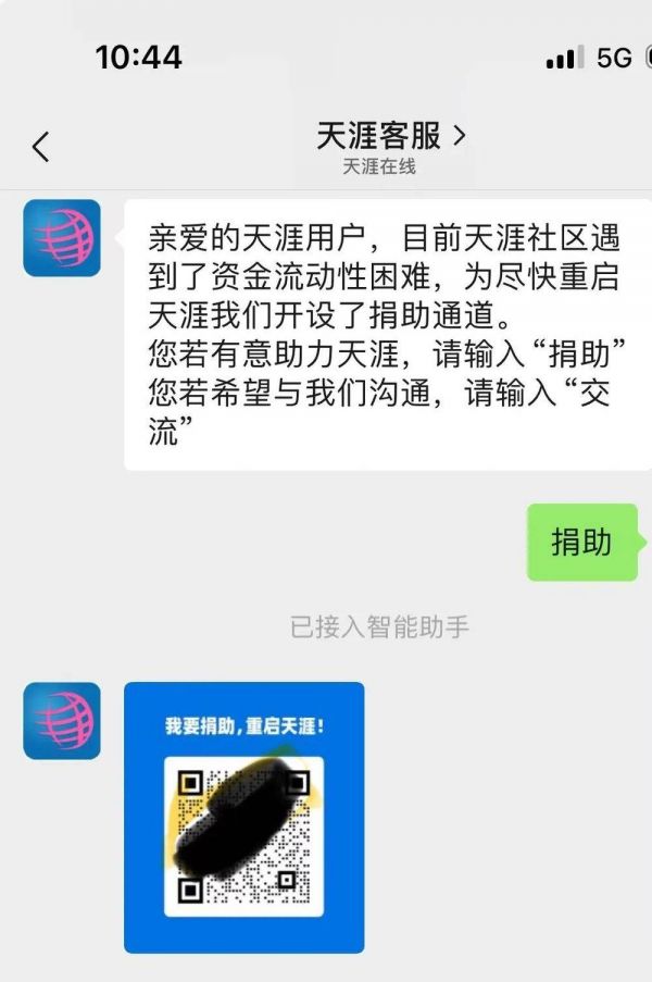 2月27日,天涯社区官网已显示“无法访问此页面”。值得一提的是,在“天涯社区”微信公众号输入“捐助”时,聊天对话框弹出二维码以及“捐助”说明。