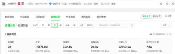 根据飞瓜数据,近一个月与辉同行基本上保持着场均在线人数7.8w+,同期东方甄选的场均在线人数已经跌至1.1w。