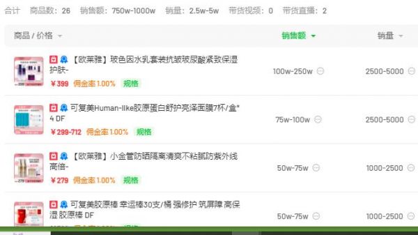 1月30日,与辉同行直播间首次开设“化妆品专场”,当天上架了三十多款化妆品,包括21款美妆护肤产品链接、5款香水彩妆链接,销售额虽不及李佳琦,但也绝对是同行翘楚。据飞瓜数据,“美妆”相关品类销售额在750w到1000w间。