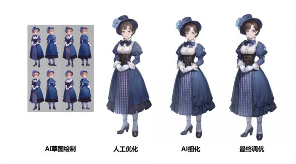 “以维多利亚服饰女性角色的原画为例。我们首先给出一系列提示词,比如站姿、维多利亚时期、全身像等。AI就可以基于我们的需求,大量产出一系列概念原型,供我们挑选。接下来,我们选中某一个AI生产的概念原型后,会人工进行一些调整,然后再交给AI进行进一步的优化、打磨。最终,我们对AI优化后的图片再进行一些细微的人工调优,就生产了足以实际使用的美术资源。”王传鹏举例道。
