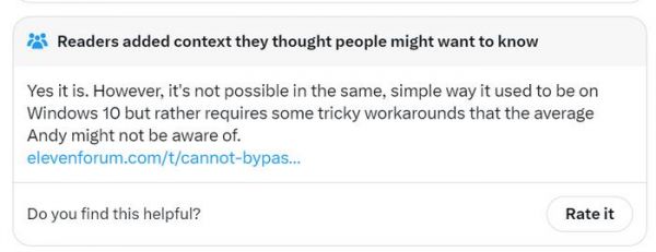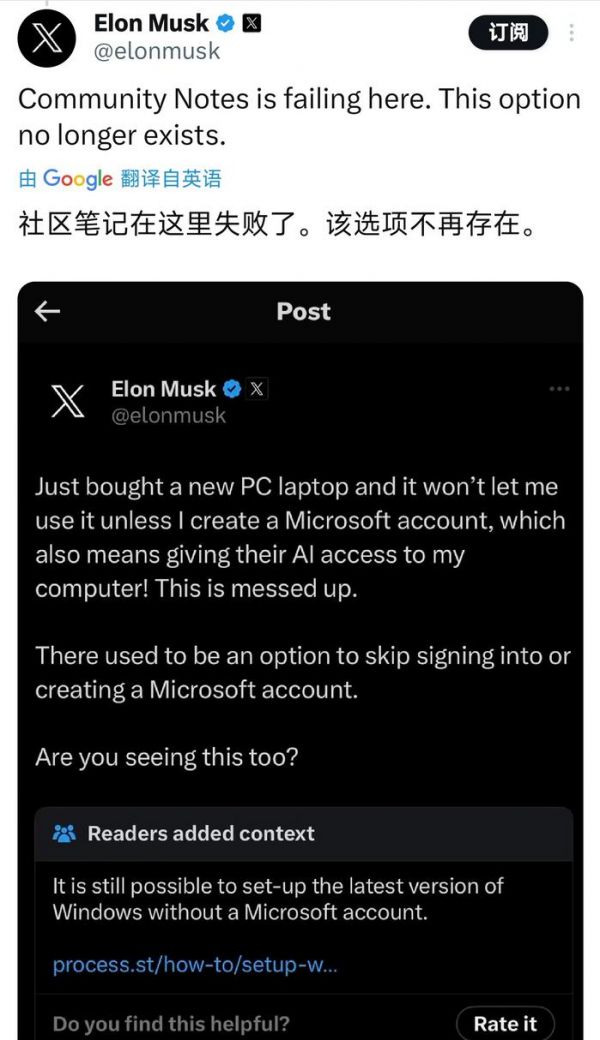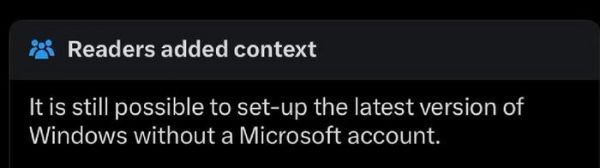 X为了减少虚假内容而推出的Community Notes(社区笔记)功能,在这则帖子下却“贴心”地提示:在没有微软账户的情况下,仍然可以安装最新版本的Windows。