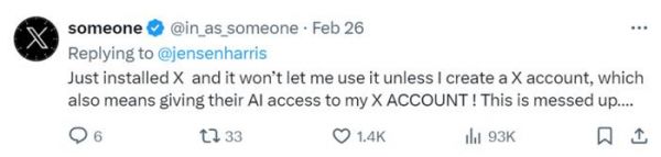 于是网友们再次用相同的口吻调侃道:刚刚安装了X,它不会让我使用它,除非我创建一个X账户,这也意味着让他们的AI访问我的X账户!这太糟糕了……
