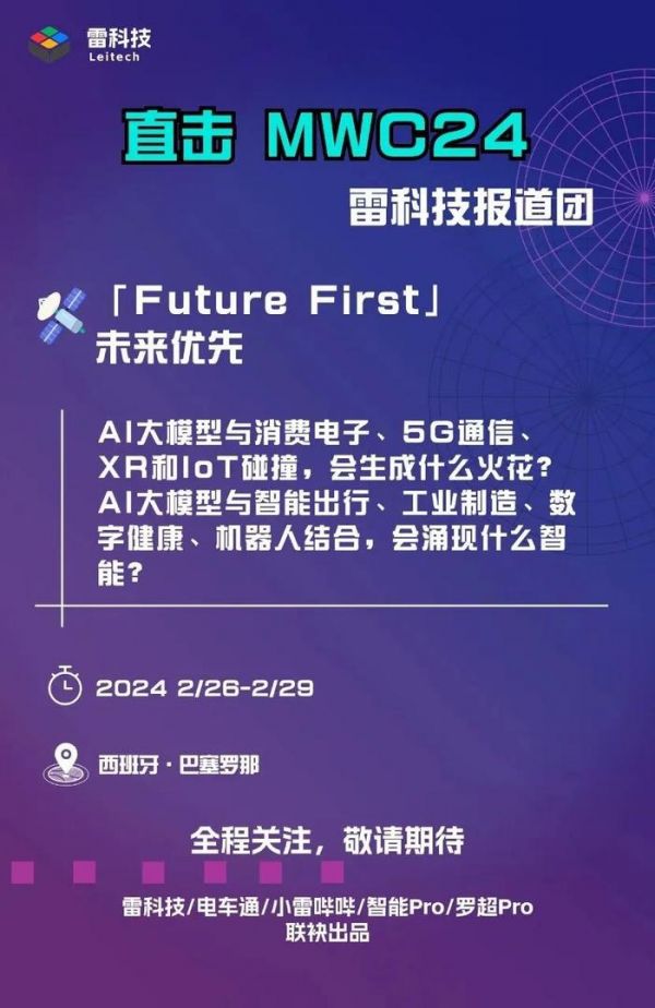 (图片来源:雷科技现场报道团摄制)2月26日-2月29日,MWC(世界移动通信大会) 2024盛大开幕,荣耀、小米、华为、OPPO、一加、传音、Nothing、联想、联发科、高通、中国移动等科技大厂均有新品发布。此外,今年的MWC还有一大看点是AI硬件,AI与手机、PC、汽车、XR、可穿戴设备加速融合将碰撞出全新火花。由“庄天明”和“定西”领衔的雷科技MWC 2024报道团正在现场进行全程追踪报道,敬请关注雷科技一起期待。