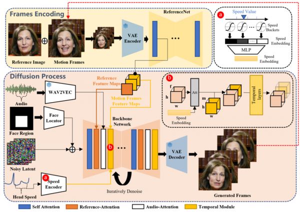 去噪过程:在生成过程中,Backbone Network尝试去除多帧噪声,生成连续的视频帧。去噪过程中,参考特征和音频特征被结合使用,以生成高度真实和表情丰富的视频内容。