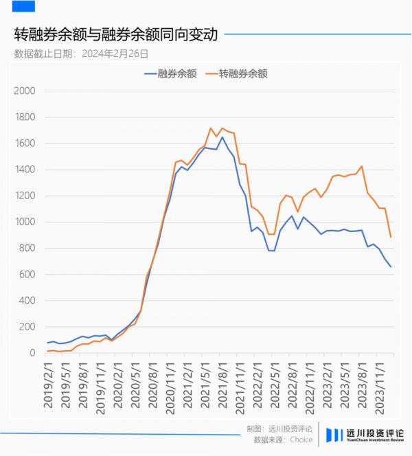 从原理上讲,转融通中的证券出借人如公募基金、社保基金等等,他们主要通过股价的上涨来获得收益,当股价跌幅过大时,他们转融券的动力理应有所减弱。整体来看也确实如此,2022年开始,信用交易系统中不仅融券规模在下降,转融券余额也基本保持了同步收缩。