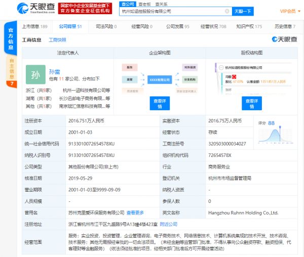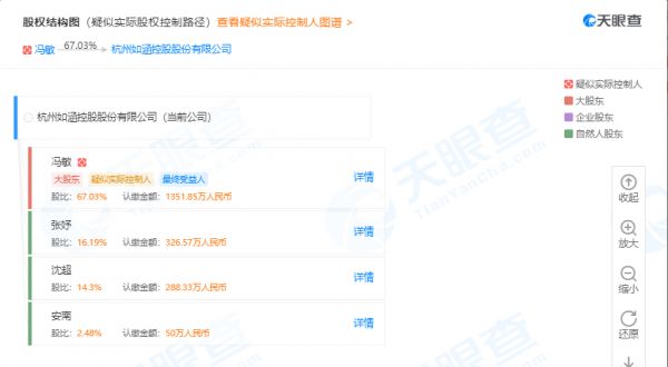 天眼查数据显示,如涵的运营主体为杭州如涵控股股份有限公司,成立时间为2001年1月,注册资本约2016万人民币,法定代表人为孙雷,最终受益人、疑似实际控制人为曾创办了优邮电商的如涵电商创始人、CEO冯敏,持股比例67.03%。