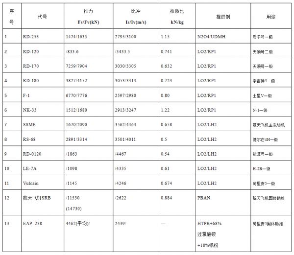 国外有几款大型液体火箭的推力达到了300吨级以上。如用于天顶号一级的RD-170发动机海平面推力为740吨,用于宇宙神5的RD-180发动机推力为400吨,用于德尔它4H一级和助推的RS-68发动机推力为300吨。土星5一级的F-1发动机推力为680吨。