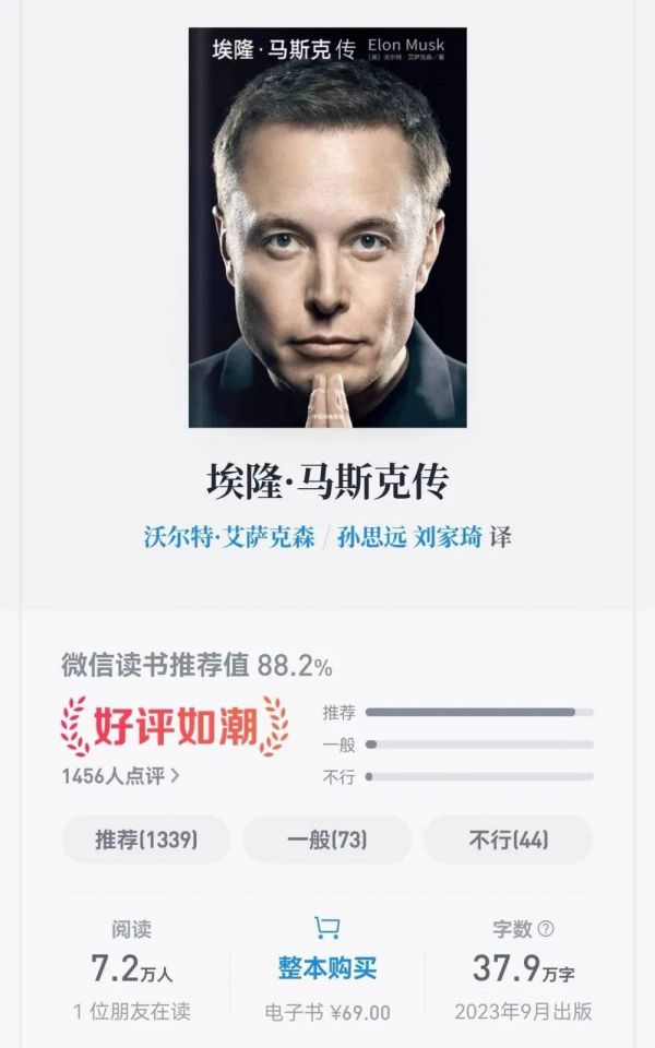 《埃隆·马斯克传》目前在微信读书已再次上架,仅供单本购买,售价69元。