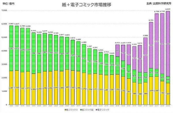 日本漫画自2014年实行电子化以来,历经整整十年,电子漫画在漫画市场的销售额比例从最初的20%上升到如今的70%。关超感叹道:“健康成熟的出版市场是这样的。”(图/日本出版科学研究所)