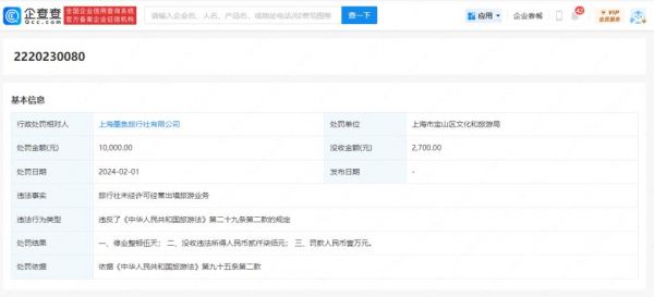 企查查显示,该文书列举了墨鱼旅行母公司上海善臻文化传媒有限公司全资控股的上海墨鱼旅行社有限公司经许可经营出境旅游业务的违法事实,披露这家公司违反了《中华人民共和国旅游法》第二十九条第二款的规定。