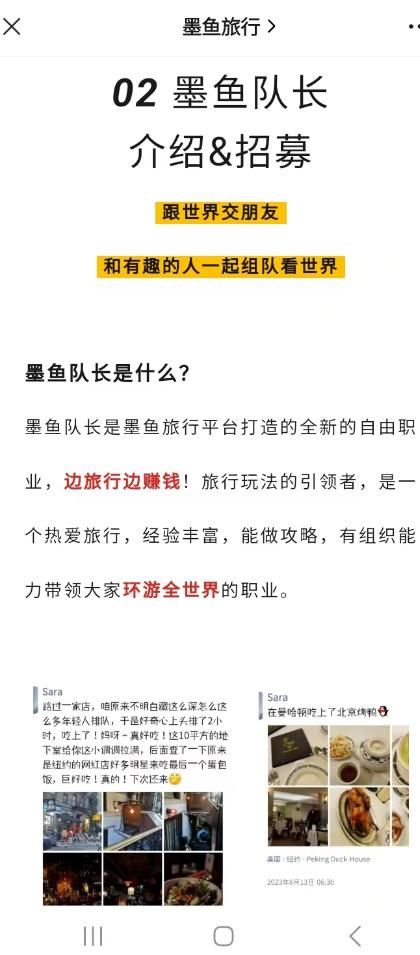 在墨鱼旅行官方公众号的“队长介绍&招募”页面,称墨鱼队长是墨鱼旅行平台打造的全新的自由职业,是一个热爱旅行,经验丰富,能做攻略,有组织能力带领大家环游全世界的职业。