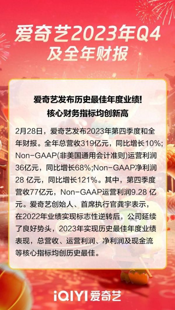 爱奇艺发布史上最佳年度业绩! 2023年总营收319亿元 均创新高