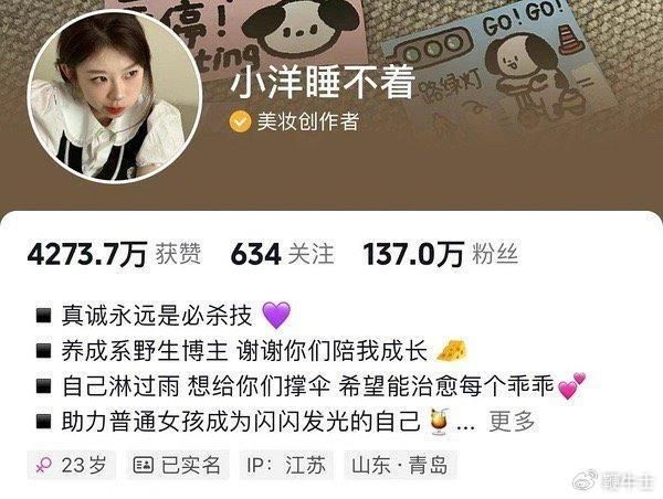 公开数据显示,小洋睡不着目前在抖音拥有137万粉丝,获赞4273.7万。