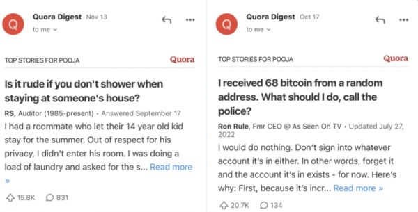 而如今的 Quora 却像一个信息垃圾场,选择订阅每日摘要的用户们会收到各种莫名其妙的问题的推送,诸如“在别人家过夜不洗澡是不是很无礼?”“我收到匿名邮箱发来的 68 个比特币,我该报警吗?”“希特勒本人真的是好人吗?”“我丈夫出于愤怒,不小心把我们 4 岁的女儿从 40 楼的窗户上推了下来,如何防止我丈夫被判入狱?”点击和讨论量还非常高。