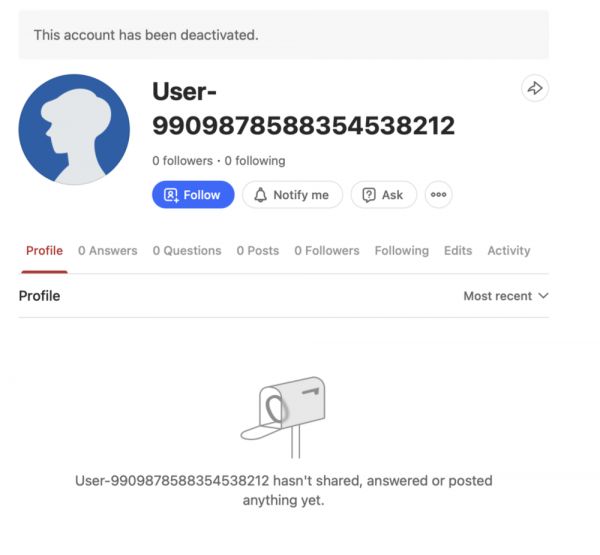 在用户量快速增长,时代也出现了保守化倾向的背景下,Quora 曾经的好奇、友善、求知的社区氛围,出现了明显的劣币驱逐良币。如今点进一些早期 Quora 用户的主页,会发现很多都已经注销账户,无法访问。