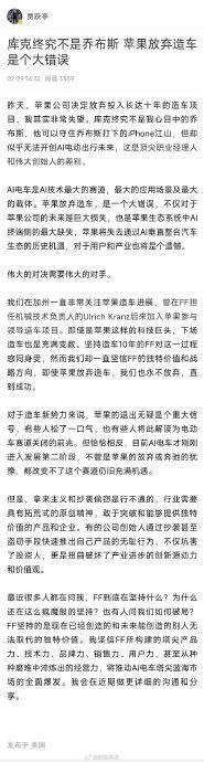 【#贾跃亭称苹果取消造车是大错误##贾跃亭称库克终究不是乔布斯#】今日下午,针对苹果公司已搁置、取消自动驾驶电动汽车所有开发计划,法拉第未来创始人贾跃亭发表长文称“库克终究不是乔布斯,苹果放弃造车是个大错误”。全文附图。