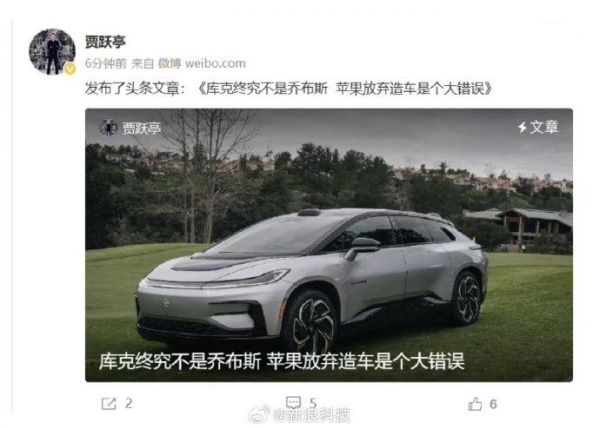 贾跃亭称苹果取消造车是大错误,库克终究不是乔布斯