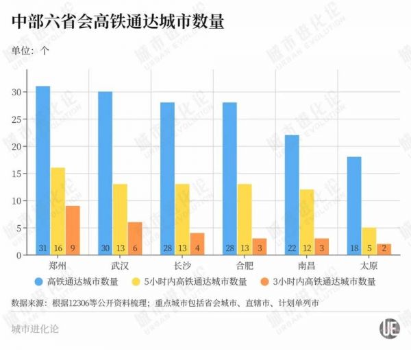 综合来看,郑州在中部高铁通达度上领先,武汉紧随其后。长沙与合肥、南昌同处第二梯队,彼此各项数据在伯仲之间。